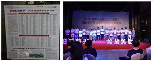 2017年8月18日下午,2017利群陽光助學行動(重慶)學子報告會暨助學金發放儀式在重慶渝澳國際藝術中心舉行。全國人大原常委、重慶市人民政府原副市長程貽舉,浙江中煙工業有限責任公司市場營銷部副總經理馬秋蓮,重慶晨報負責人,共青團沙坪壩區委書記王韻,重慶市大愛渝商慈善基金會副理事長李軍亞,愛心企業代表重慶洋世達(實業)集團有限公司行政人事總監陳靜等嘉賓出席本次活動?;顒又校c會嘉賓為151名來自永川、銅梁、大足、涪陵、奉節等區縣的每位陽光學子頒發了5000元愛心助學金、暖心的新書包和一件白色T恤衫。