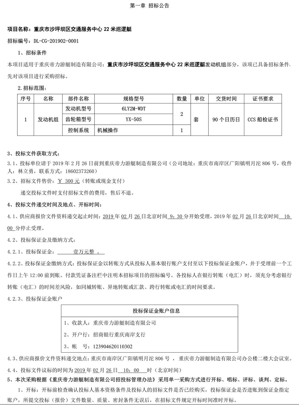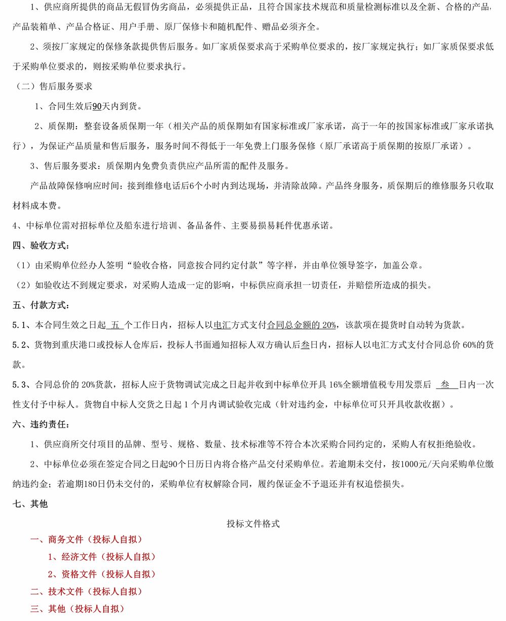 重慶市沙坪壩區交通服務中心22米巡邏艇電設備采購招標文件