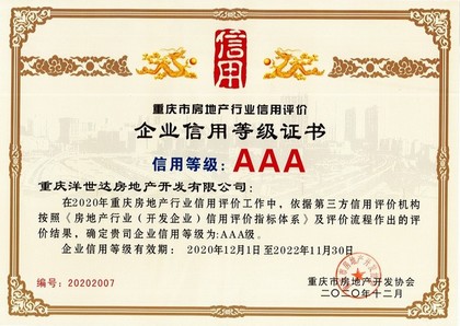 重慶洋世達(dá)房地產(chǎn)開(kāi)發(fā)有限公司榮獲“重慶市房地產(chǎn)開(kāi)發(fā)協(xié)會(huì)2020年度優(yōu)秀會(huì)員單位”稱(chēng)號(hào)和重慶市房地產(chǎn)行業(yè)信用評(píng)價(jià)信用等級(jí)AAA級(jí)證書(shū)。