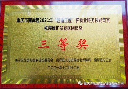 2021年12月11月、12日,南岸區住房和城鄉建設委員會、南岸區人力資源社會保障局、南岸區總工會組織的"巴渝工匠"杯物業服務技能大賽在南岸區重慶建筑工程職業學院隆重舉行。