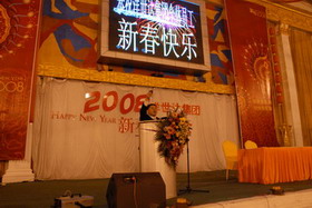在進行兩個多小時的自由活動后,晚上五點半,大家團聚在一起,舉行了熱烈、喜慶的迎新春團年晚宴。集團公司董事長、總裁楊勇先生發表了熱情洋溢的新春賀辭,并為全體員工派發紅包。大家舉起酒杯,共同分享過去一年成功的喜悅,暢談2008年的美好前景,感受家庭般的溫馨和傳統節日的快樂,盡興而歸。