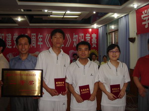 2006年6月12日下午,為慶祝中國(guó)共產(chǎn)黨建黨85周年,重慶市南岸區(qū)南坪鎮(zhèn)黨委開(kāi)展了《黨章》知識(shí)競(jìng)賽。我公司黨委選派周隼、趙偉、劉伶伶三位同志參加了比賽,經(jīng)過(guò)激烈的必答題、搶答題和風(fēng)險(xiǎn)題3輪競(jìng)爭(zhēng),最后取得了二等獎(jiǎng)。